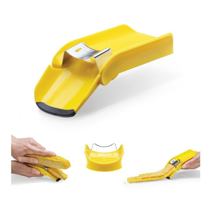 You little stripper: Curved Japanese stainless steel blade is at the perfect depth and angle to ensure whole kernels are stripped without digging into the corn cob.