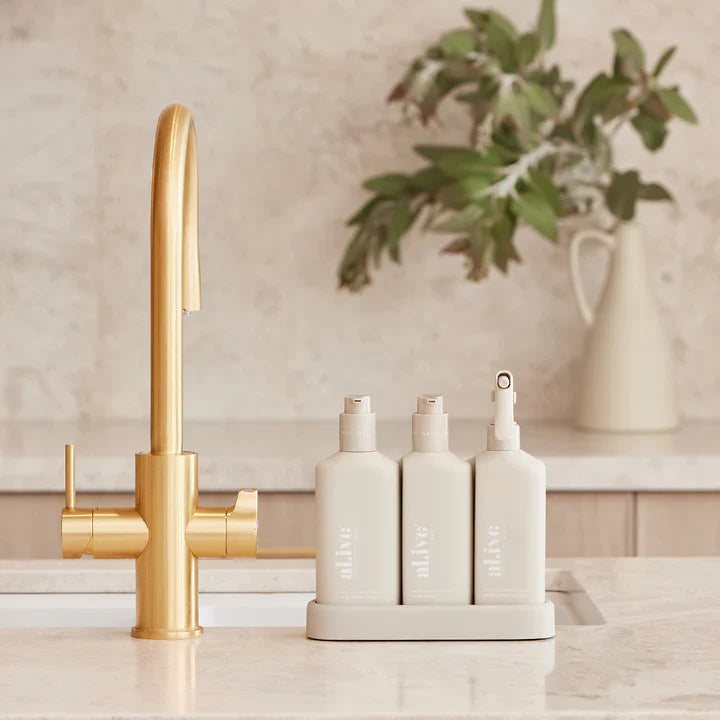 The al.ive body Dishwashing Liquid, Hand Wash & Bench Spray Kitchen Trio is a beautiful yet practical product, elegantly packaged to elevate your countertop.