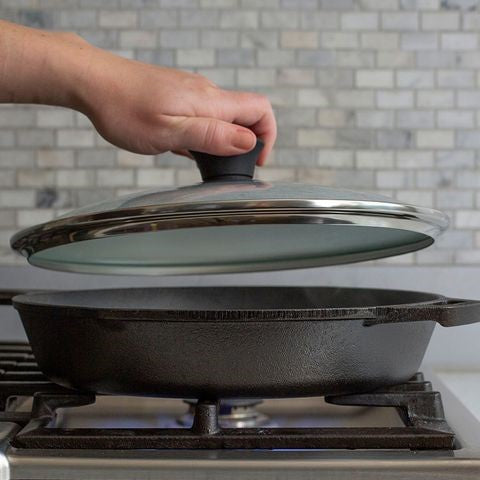 This 30cm tempered glass lid with stainless steel rim is light weight and allows for peeking without losing moisture and flavour.