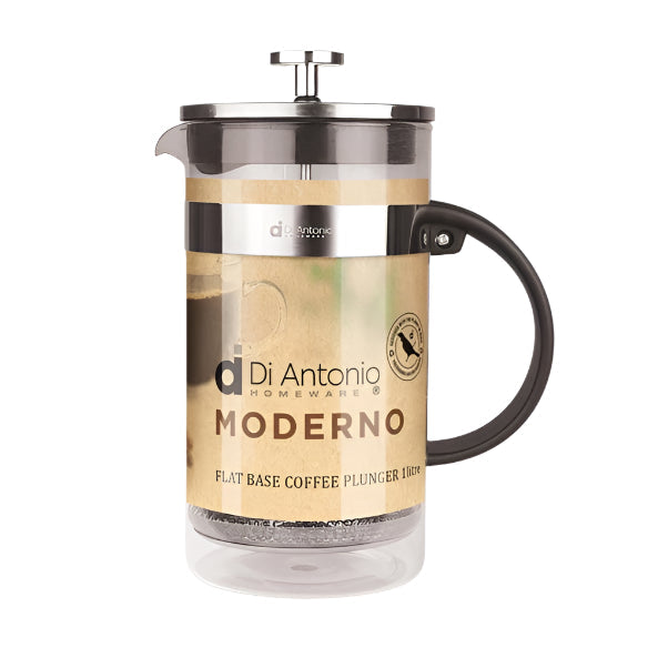 Moderno plunger uses heat resistant glass and has a stainless steel banded holding frame.