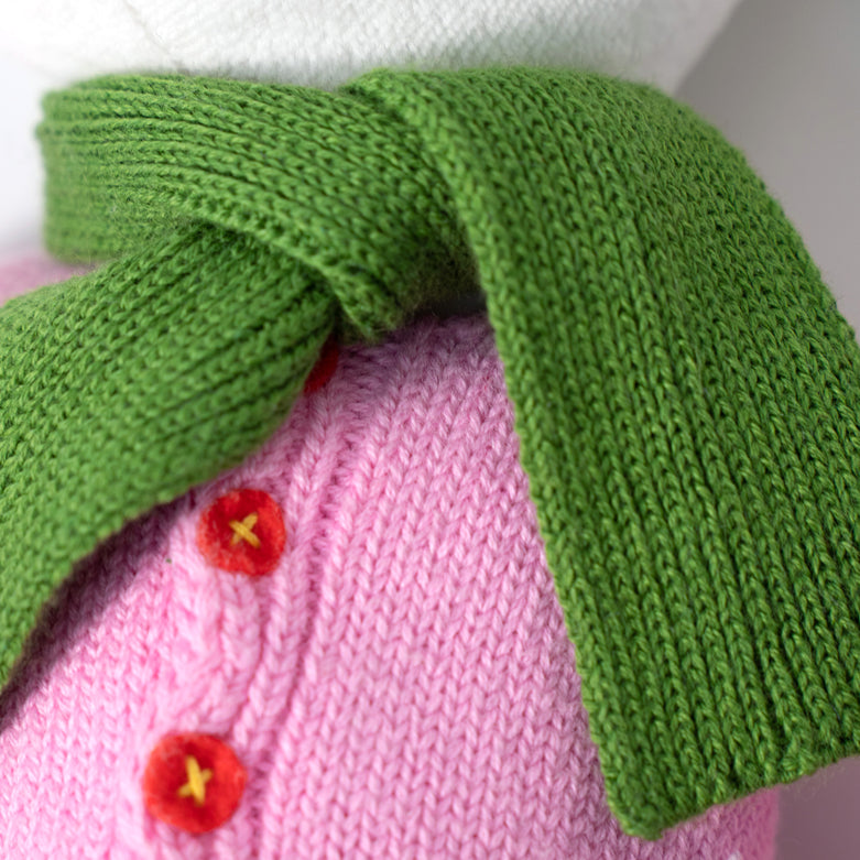 She can't wait to show you her pretty new look. She's hopping around in a limited edition Ruby Red Shoes cameo print dress, a pretty pink cardigan, and an evergreen scarf. She's looking forward to a warm welcome into your home and hearts.