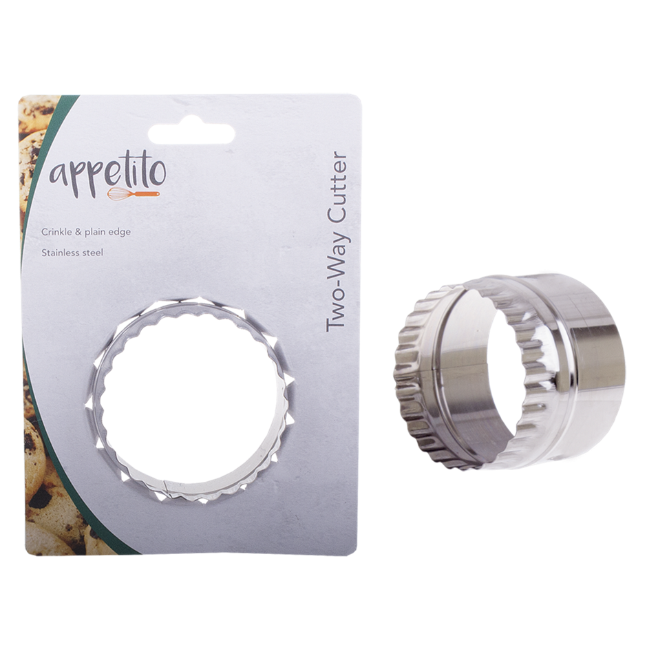Dough and pastries are a synch with the Two-Way Cutter from Appetito, made from durable easy-to-clean stainless steel it's a must for any baker. Cut with precision using both crinkle edge (6cm) and plain edge (6.5cm) sides.