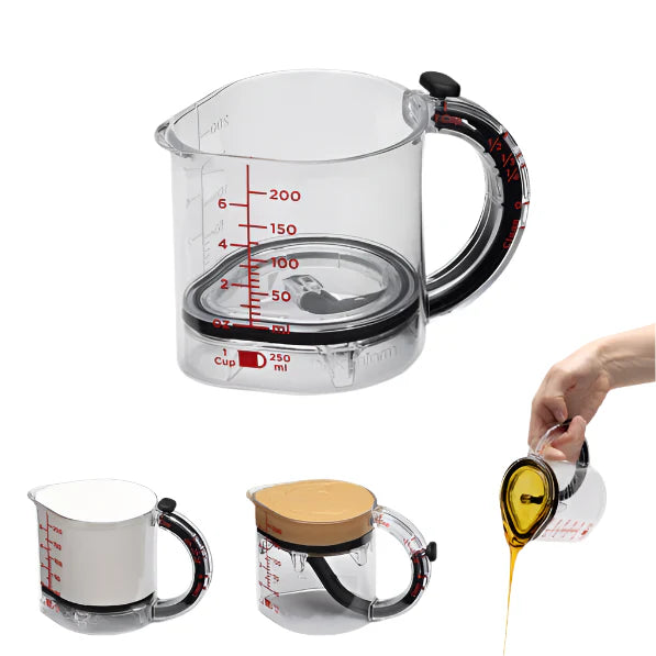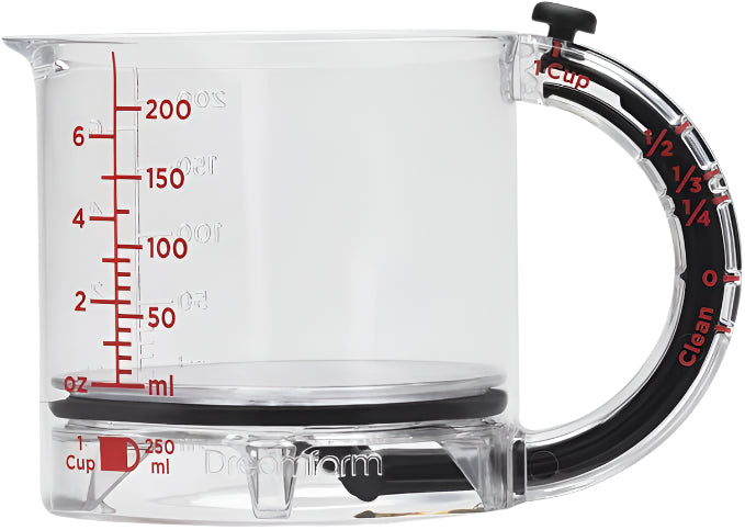 Upcup’s adjustable base raises to create 250ml (1 cup), 1/2 cup, 1/3 cup, and 1/4 cup measurements, all in a single cup